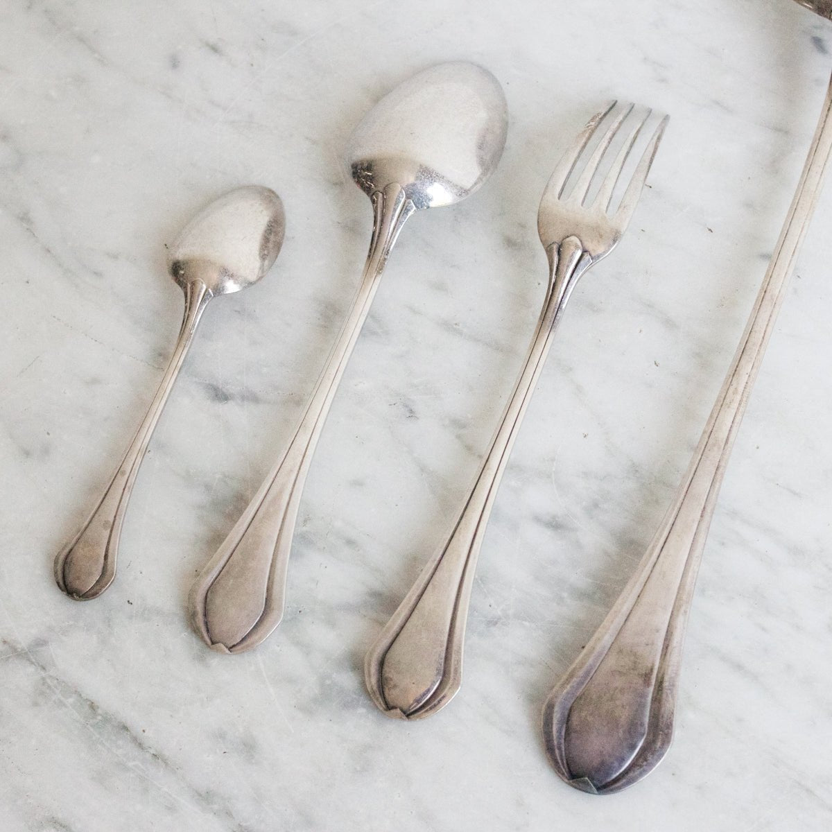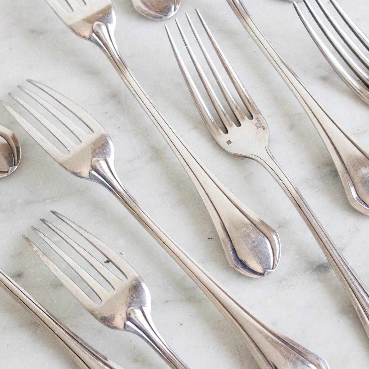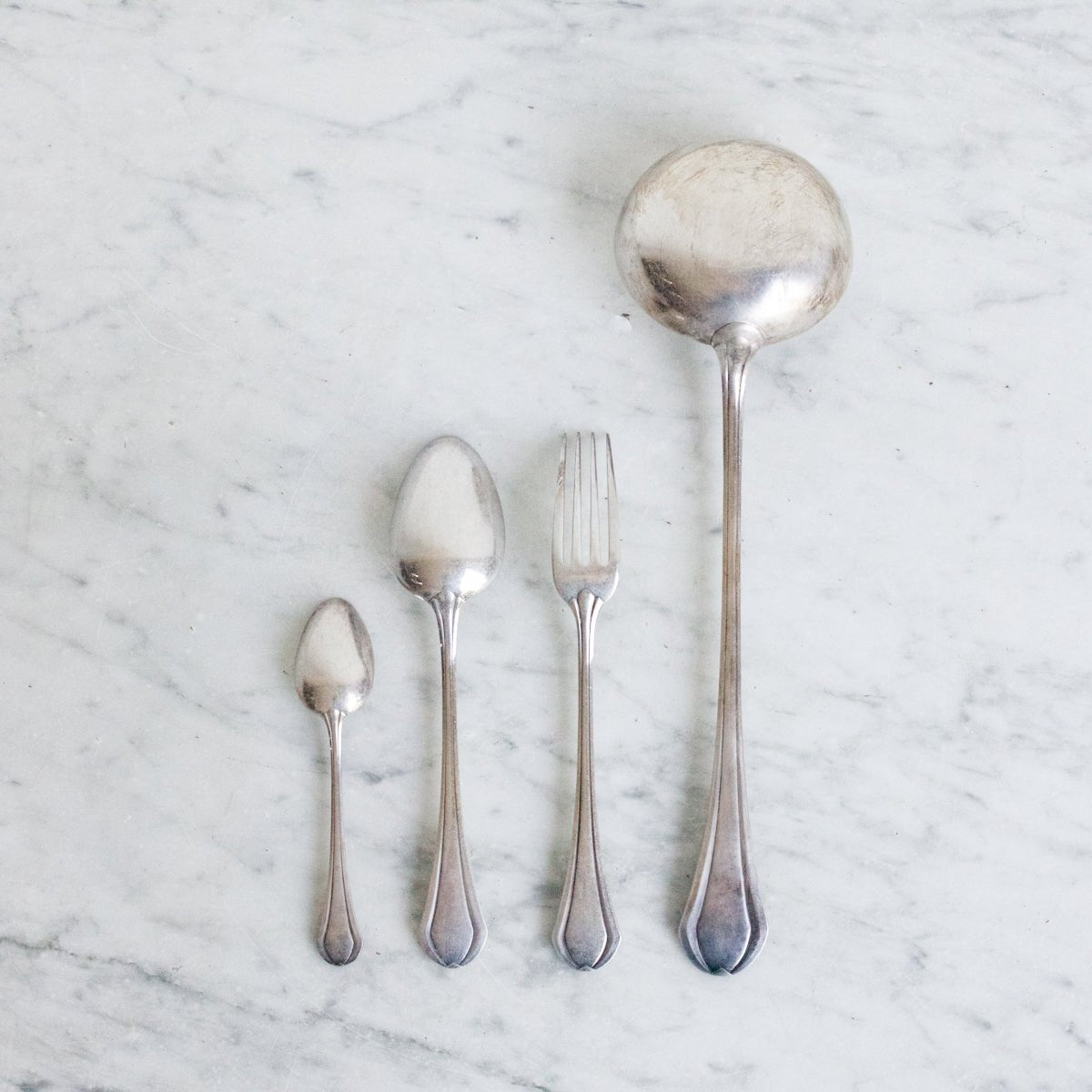 - L'ensemble comprend 12 cuillères à café, 12 cuillères à soupe, 12 fourchettes à dîner, une louche et une boîte de rangement d'origine.